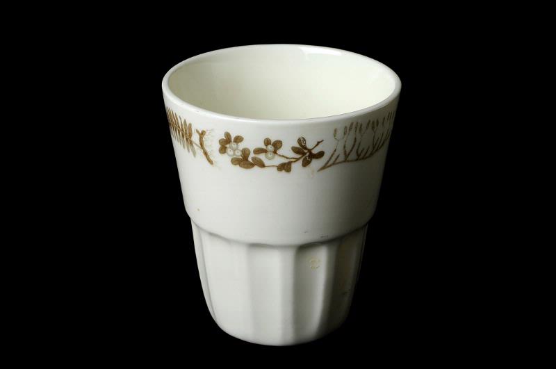 STLM 106 Porslinsmugg. Diam: 9,5 cm. Höjd: 11 cm. Mugg av benporslin med brunt blomstermotiv (Medicinrankan). Märkt: GUSTAVSBERGS BENPORSLIN 190-9 14.