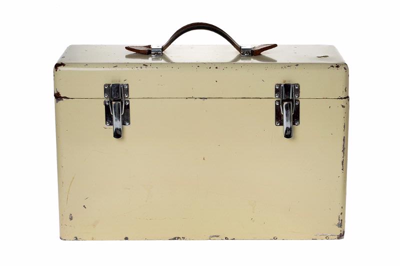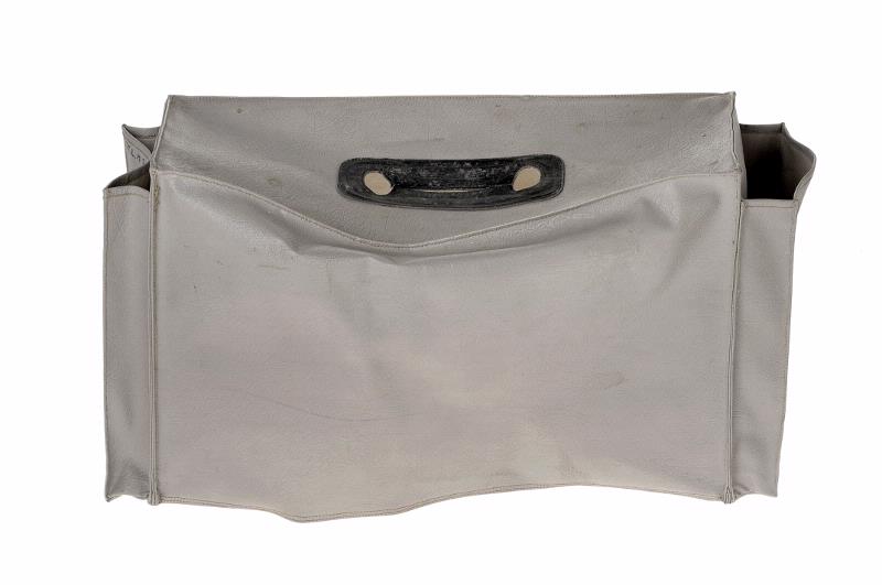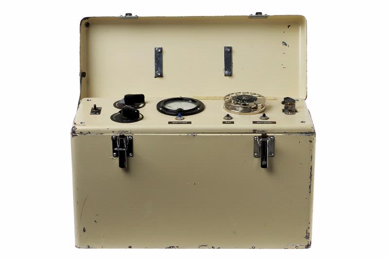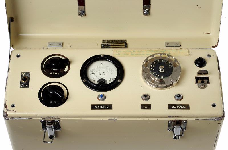 STLM 289. Elchocksapparat. L 42 cm, B 16 cm, H 27 cm.1: Elchocksapparat vitlackerad. 2: Elektrohållare [elektrodhållare] med tyghuva och läder remmar samt 2 m elsladd. 3: Apparaten har ett grått plast fodral. Varumärkt: JÄRNHS ELEKTRISKA AB STOCKHOLM TYP. NR. EM. 420
