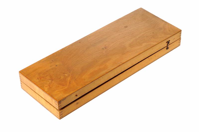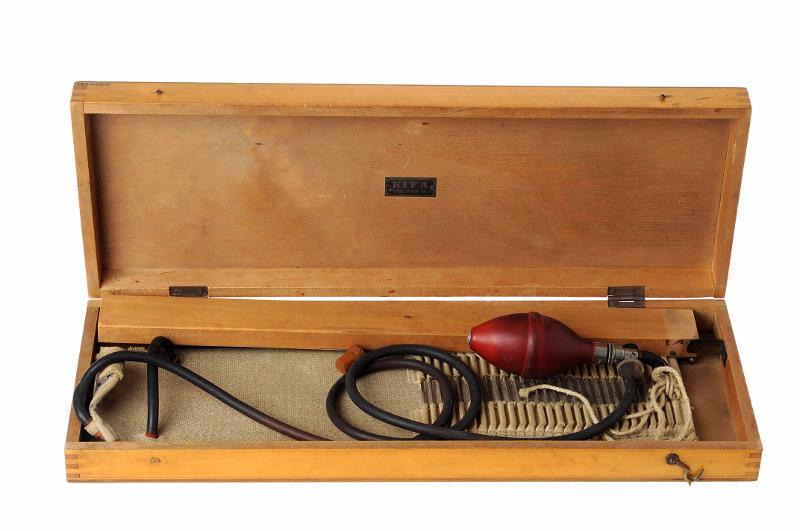 MS 4205. Blodtrycksmätare, enligt Stille. Med kvicksilvermanometer graderad från 0 till 32, bollpump av gummi samt stegmanschett (enligt Lindberg) av beige väv. I etui med lock av trä märkt KIFA Stockholm. L 450 mm, B 160 mm, H 55 mm.