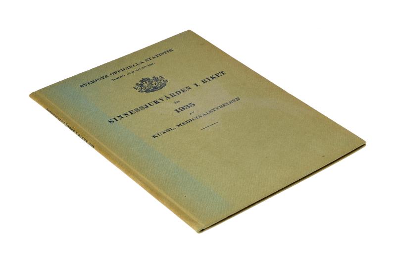 VS 1292. Skrift. Titel: Sveriges officiella statistik Hälso- och Sjukvård, Sinnessjukvården i Riket år 1935. Utgivare: Kungliga Medicinalstyrelsen. Tryckeri: Kungliga Boktryceriet P. A. Norstedts & Söner, Stockholm. Tryckår: 1937. Inbunden. Grå-grönt strukturmönstrat omslag, ursprungligen blått. 30 sidor. På insidan av främre pärmen skrivet med kulspetspenna: Vipeholms Sjh.