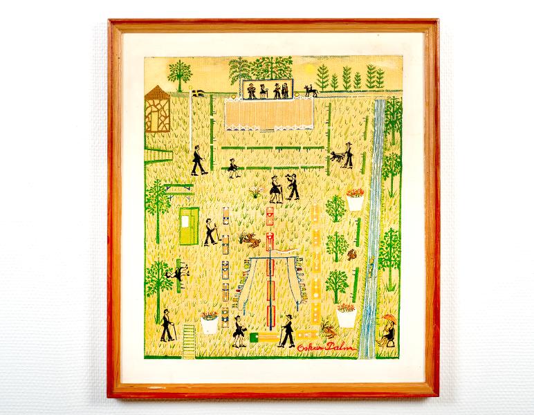 - Målningen avbildar en exteriör, en karikatyrliknande bild av en stadspark, uppdelad i geometriska fält. På motivet 16 människor målade i svart, en sittande kvinna har ett rött parasoll. I överkant en dansbana med 3-manna orkester och en vokalissa. Till vänster om denna en flaggstång med svensk flagga. Till höger löper en bäck lodrätt över bilden. I fonden, centralt placerat, syns ett flaggspel samt ett fält avgränsat av blå, röda och gula rektanglar, vilket påminner om något slags schiffer.
