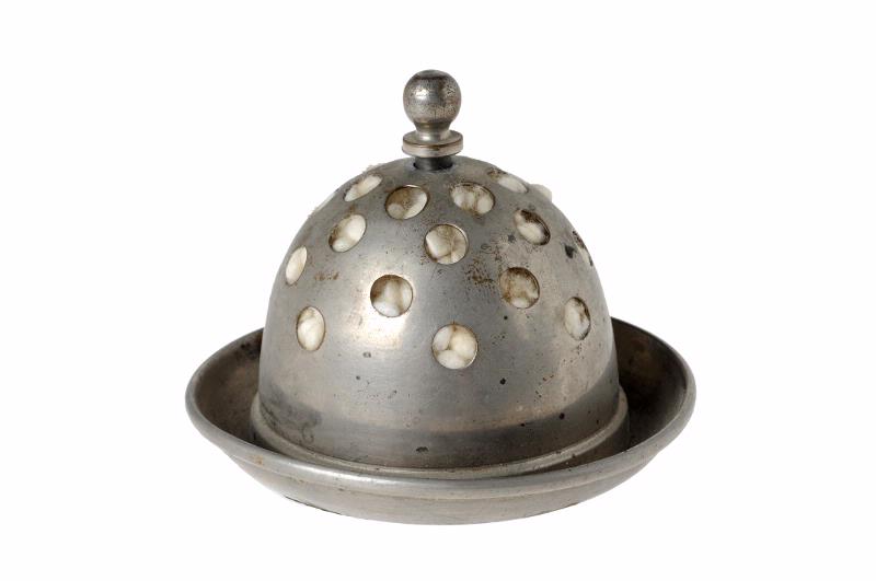 MS 6989. Pelletsbehållare. Förkromad metall, Diam 88, H 55 mm. Gåva 1975-01 av tandläkare Gustav Erwall.