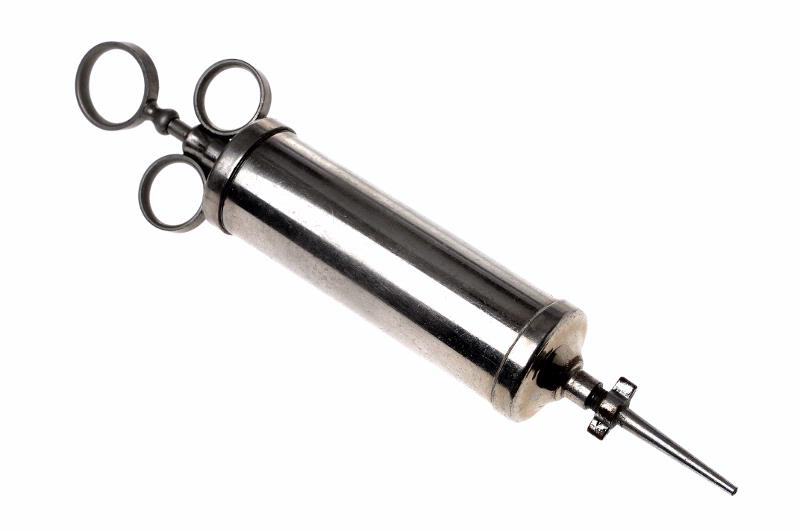 MS 4732. Sårspruta. L utan spets ca 215 mm Diam ca 40 mm. Spets finns. Metall, med tre ringar. Kifa.