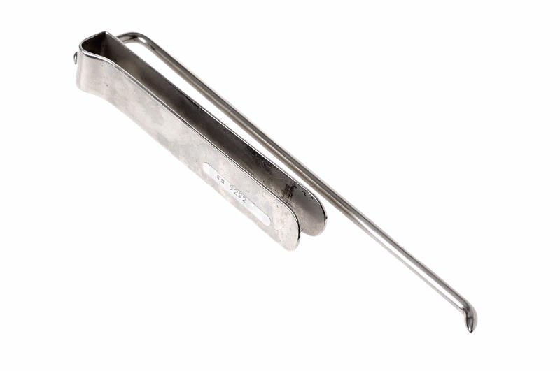 MS 9292. Väskhållare. Större klämmans L 120 mm, krokens L 120 mm. Rostfri. Förvärvad 1986 från Maria Lindqvist.