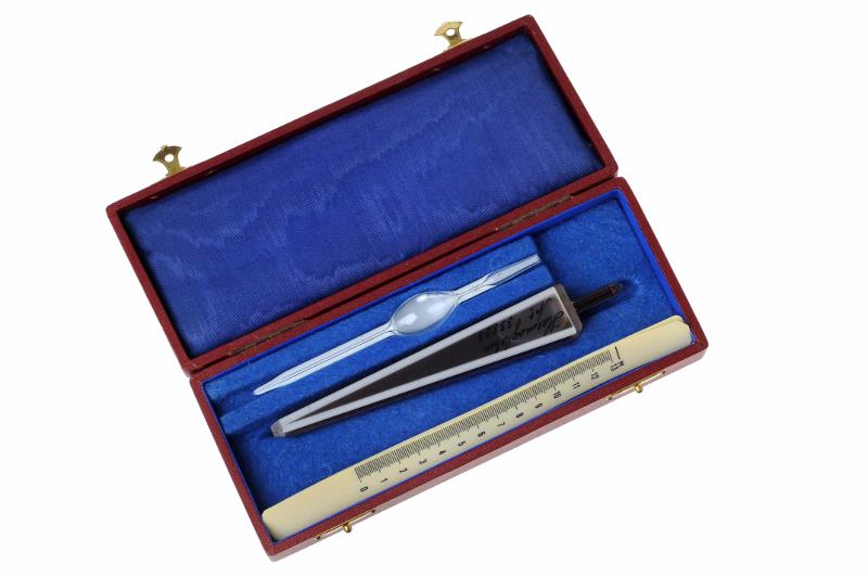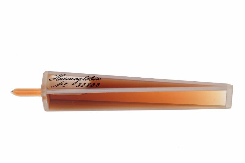 MS 4968. Kolorimeter med okular. H 195 mm. Svartmålad metall, märkt "F. Hellige & Co" Nr. 35362. Med en fylld haemoglobinkil. Tillhörane etui registrerat under MS 4969.
