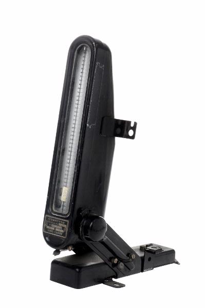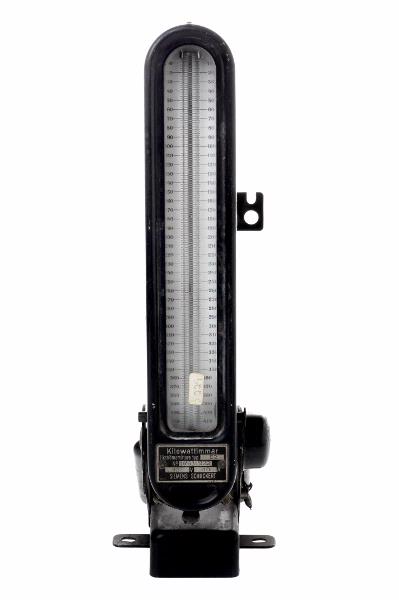 - Av svartmålad metall, märkt "Kilowattimmar, Likströmsmätare typ E2, No 16631922, 120 V, 10 A, Siemens-Schuckert". Bruksanvisning med text och teckningar på två ark gulnat papper, medföljer. Mätare med glas på ovansidan. Är höj och- sänkbar.