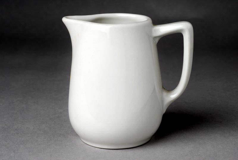 MS 5295. Gräddkanna. H 90 mm, Diam 50 mm, Diam botten 50 mm. Vitt porslin, märkt "Rörstrand Sverige 472" med grågrön skrift.