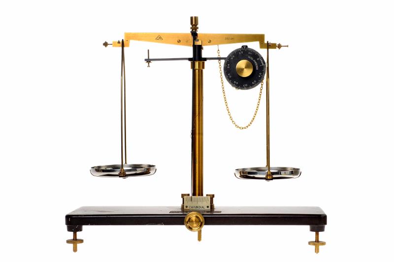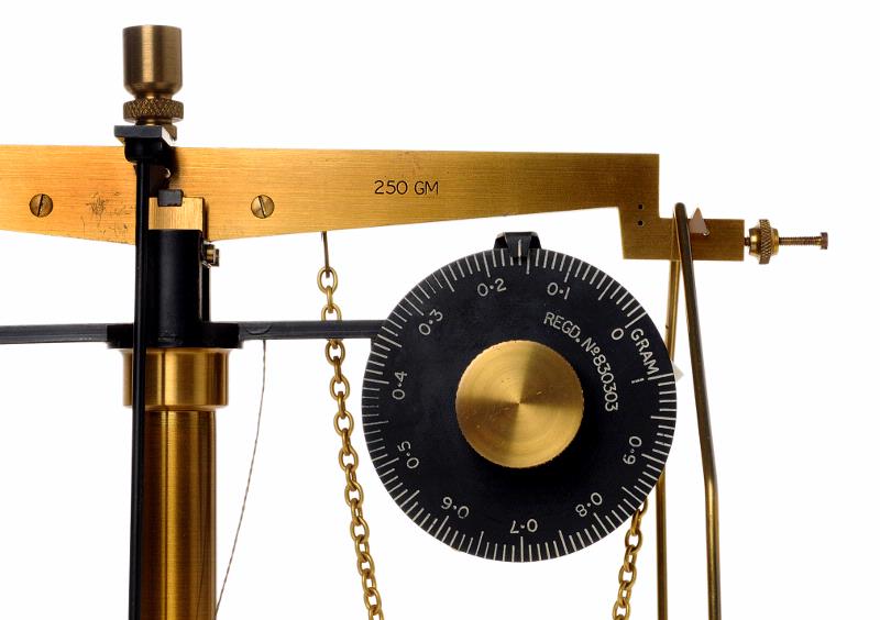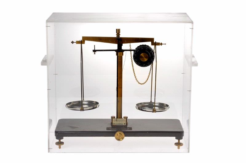 MS 1390. Precisionsvåg. Balansvåg. På brunmelerad metallplatta, L 370 mm, Br 145 mm. P:s höjd 350 mm. Vågskålarna av silvergrå metall, övriga stativet i mässing till största delen samt svart metall. Rund skala graderad från 0 - 1 gram, märkt: "Regd No 830303", med kedja. Stativet märkt: "G & T 250 GM". Bottenplattan står på tre skruvar som medger höjning och sänkning. Märkt: "Griffin & Tatlock Ltd Made in Gt Britain" (sigill och annat med bevingat djur). Tillhörande huv av plast, H 380 mm, Br 400 mm.