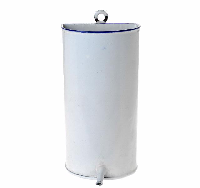 MS 5361. Irrigator-behållare. B 115 mm, H 220 mm, D ca 80 mm. För irrigation (tvättning el. dyl. genom en jämn vätskeström). Vit emalj med blå rand upptill. Pip för slang vid botten. Ring för upphängning. Ej märkt. Från Röda Korsets krigsförråd i Malmö 1914-1918.