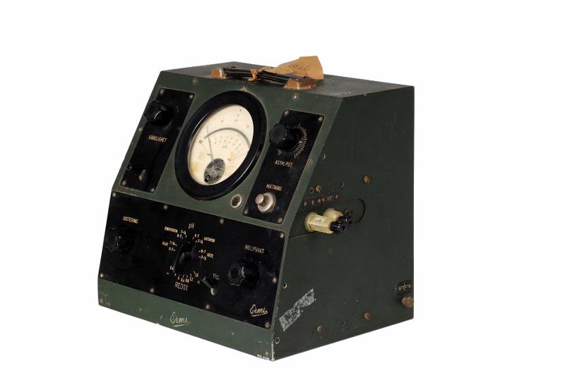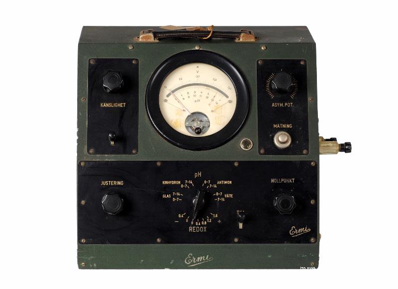MS 1495. pH-mätare. L 340 mm H 310 mm Br 250 mm. Av metall. Grönlackerad. Graderad skala 0-1,4; 0-7; 7-14. Märkt: "Ermi L M Ericsson. [Avbildad på katalogkort]. R XXVII:8.