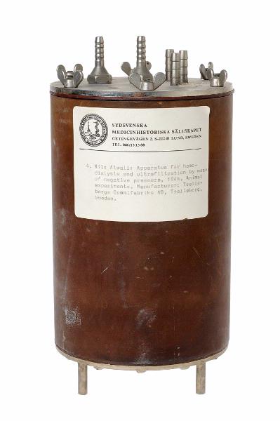 MS 11444. Dialysapparat i ebonit och rostfritt stål. Består ev cylinder och behållare med lock. Cylinderns H 180, Diam 100, Tjockl 15. Behållarens H 188, Diam 130, Tjockl 14. Lock Diam 130, Tjockl 4. Cylinder och behållare av ebonit. Lock och botten i rostfritt stål, locket fästes med sex vingmuttrar. På locket fem kopplingar för ut- och ingående blod- och dialysvätska. Mellan behållare och lock en gummiring. Behållaren står på fyra fötter och har avtappningskran i botten. Behållaren är räfflad på insidan, cylindern på utsidan. Runt cylindern är en ståltråd lindad i spiral. Inne i cylindern en gummislang. Sydsvenska Medicinhistoriska sällskapets etikett: "4. Nils Alwall: Apparatus for hemodialysis and ultrafiltration by means of negative pressure, 1944. Animal experiments. Manufacturer: Trelleborgs Gummifabrik AB, Trelleborg, Sweden. Gåva av professor Nils Alwall 1971-1973.
