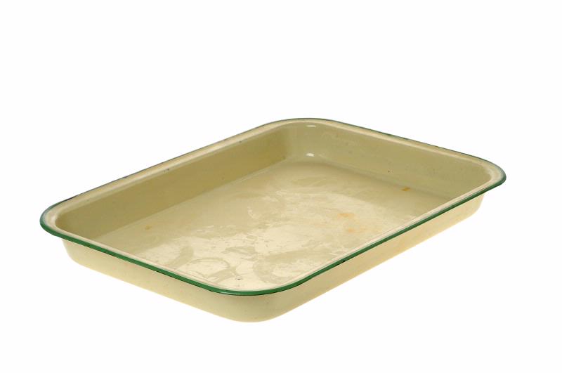 MS 5489. Bricka. L 480 mm, B 330 mm. Emalj, gulbeige med grön kant. Höga kanter H 50 mm. Sluttar utåt. Märkt Kockums Sweden 45 cm".