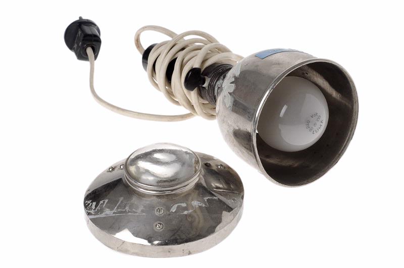 MS 1561. Lampa. L 265 mm. Svart handtag av bakelit. Strömbrytare samt förnicklat lamphus med glödlampa inuti samt "lock" (diam ca 125 mm) som är avtagbart. I mitten av detta avtagbart konvext glas. Runt, diam ca 55 mm. Vit sladd med stickkontakt. Kifa Stockholm.