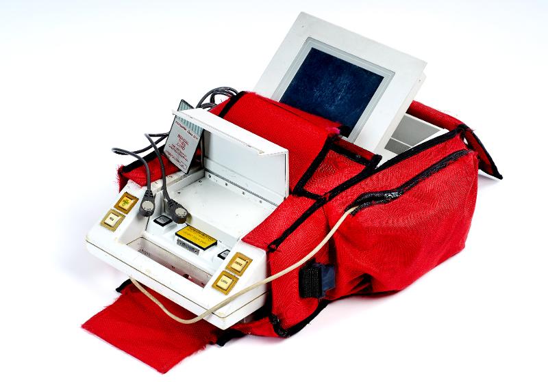 I röd väska med uppfällbara lock som fästs med kardbordband. Även skärmen uppfällbar med pappersremsa för registrering nedanför. På defibrillatorn snabbinstruktioner i 5 steg samt knappar för strömbrytare, registrering, chock och laddning. På sidan texten "DEFIB" stort i vitt.