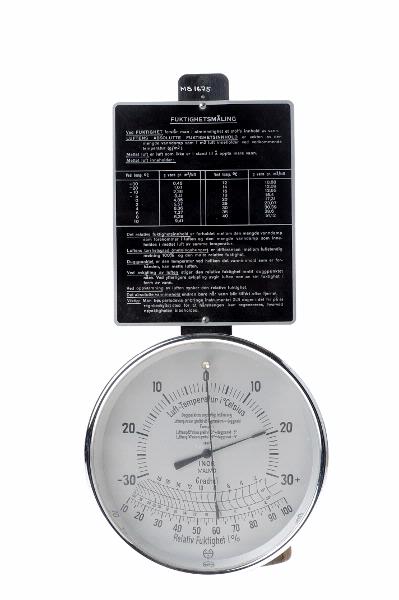 - Mäter lufttemperatur från - 30 grd C till + 30 grd C. Relativ fuktighet i % från 10 till 100 på två graderade skalor Gradtalsskalor från 2 till 18 samt 2 till 32. Märkt: "Inor Malmö". Daggpunktens ungefärliga bestämning: Lufttemperatur minus gradtal vid hygrometern = daggpunkt. Ex: Lufttemperatur 15 grd - gradtal 10 = daggpunkt - 5 grd. Hygrometern är fäst på en svart platta där också en information på danska, också på platta, finns.