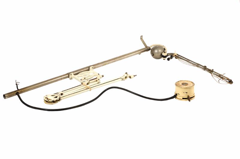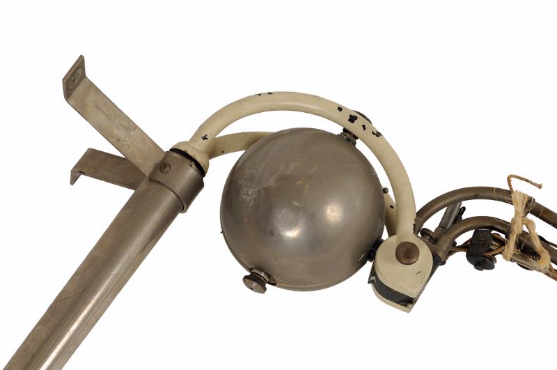 MS 1696. Tandläkarborr. Med instrumentbord. Borrstativet är av blankt stål och fastskruvas både i golvet och på väggen. En elektrisk kabel leder från detta stativ till en gullackerad plåtdosa med pedaler. Dosan är märkt. "TUG No 796 B Volt 220 Amp 0,2". I stativet sitter borrarmen ledad fram och tillbaka därefter upp och ned därefter ytterligare tre leder. Trådar och hjul driver borret. Borrmaskinen sitter i en kula mellan stativet och borrarmen. Ungefär mitt på stativet är instrumentbordet fastskruvat. Det är av vitlackeat järn, går att dragas ut och vridas åt olika håll, är ledat på fyra olika ställen. Själva instrumentplattan kan snurras runt. Tre plåthållare viid sidan om instrumentpklattan är avsedda för varmluftspruta, sprayspruta. Instrumentplattan är rund och vit och har vågig kant, består av leukolit. Stativets höjd 1600 mm Borrarmens längd 1740 ,mm, Instrumentbordsarmens längd 1390 mm. Instrumentplattans diam 360 mm.