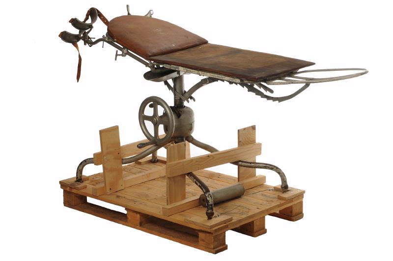 - För laparotomi och gynekologiska operationer. Stativet är silver- och vitlackerat. Bordet är tredlat och har benstöd med läderremmar. Fot- och huvudändarna är höj- och sänkbara. Mittdelen samt fotänden är stoppade och klädda med brun galonväv.