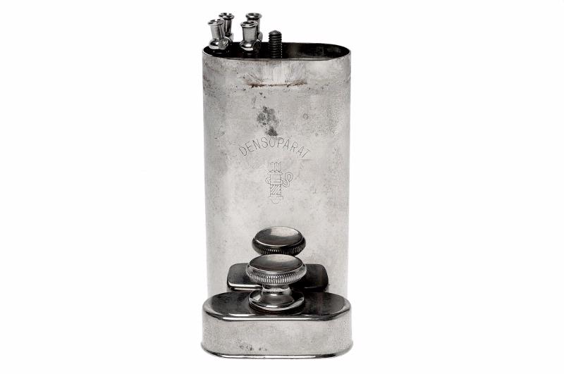 MS 5758. Metalletui med lock som skjuts på och sedan skruvas fast. Plats för spruta och 4 st kanyler (sprutan saknas). 2 av kanylerna är märkta Heufirm Chrom och 2 är märkta 20 Acufirm V2 A. Etuiet är märkt Densoparat, H 115 mm. Har tillhört stadsläkare PG Månsson, Trelleborg.