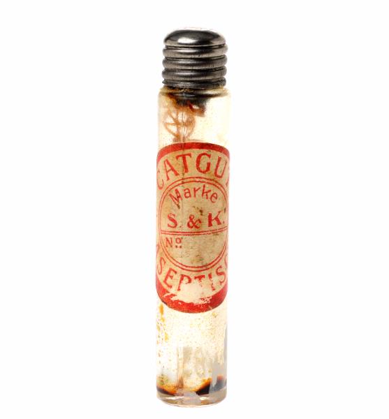 MS 9851. Catgut. Vit, i glasflaska med skruvlock. L 72 mm.
