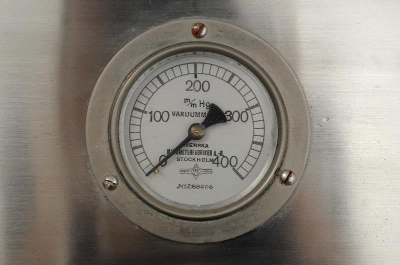 MS 5818. Sugapparat, elektrisk. L 475 mm, B 375 mm, H 955 mm. Sugflaska saknas. Metallstativ på 4 hjul. Motorn sitter i ett glashus överst på stativet och är märkt E. Hansum, Stockholm, Elektro-mekanisk verkstad Nr 617 Typ 40/5/8. Strömart ~ V 220 A 0,8 n 2800. Motoraggregatets bottenplatta är märkt 11,05, Pumpaktiebolaget Einar Egnell Stockholm. Vacuummeter graderad från 0 till 400 mm Hg märkt Svenska Manometerfabriken A.-B Stockholm [logotyp] No 288606. Gummislang samt elektrisk sladd med stickkontakt.