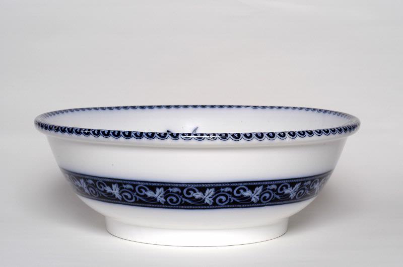 MS 5884. Tvättfat. H 130 mm, Diam 370 mm. Vitt porslin med blommönster i blått. Märkt Villeroy & Boch Dresden, Azalea.