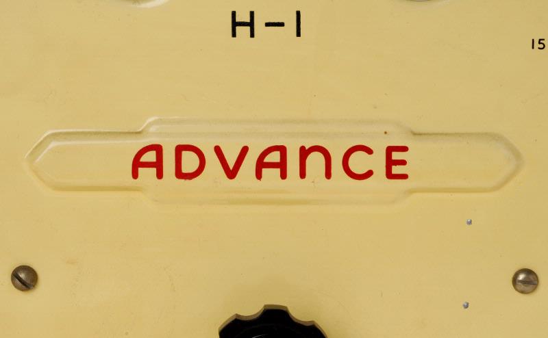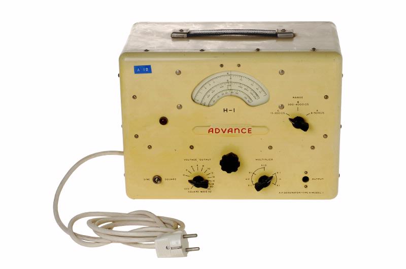 - Är gul med reglage och skala på framsidan. Märkt "Advance" med röda bokstäver. Längst ner till höger: A.F. Generator Type H Model 1. Högst upp till vänster en blå präglad lapp A 12. På baksidan märkt Advance Components Ltd. London. Lf signal generator type H model 1. Har vit sladd med vitt kontakt. Handtag på ovansidan.