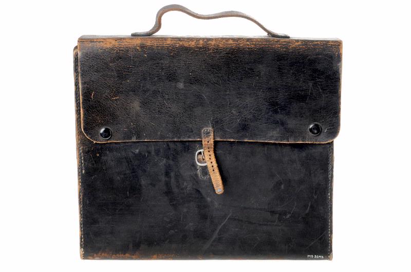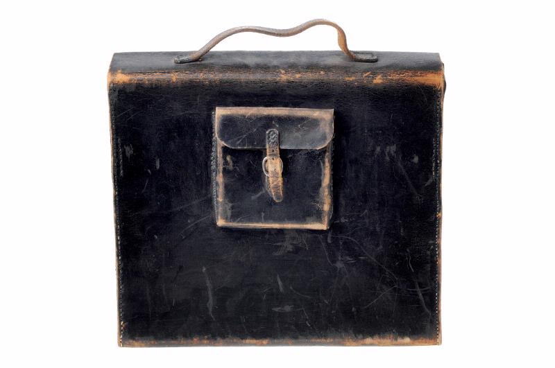 MS 2043. Instrumentväska. Av svart läder med handtag. Knäppes med två tryckknappar samt rem och spänne. Försedd med liten ficka också knäppt med rem och spänne. Invändigt försedd med tygfack. Höjd 300 mm Längd 300 mm Bredd 70 mm.