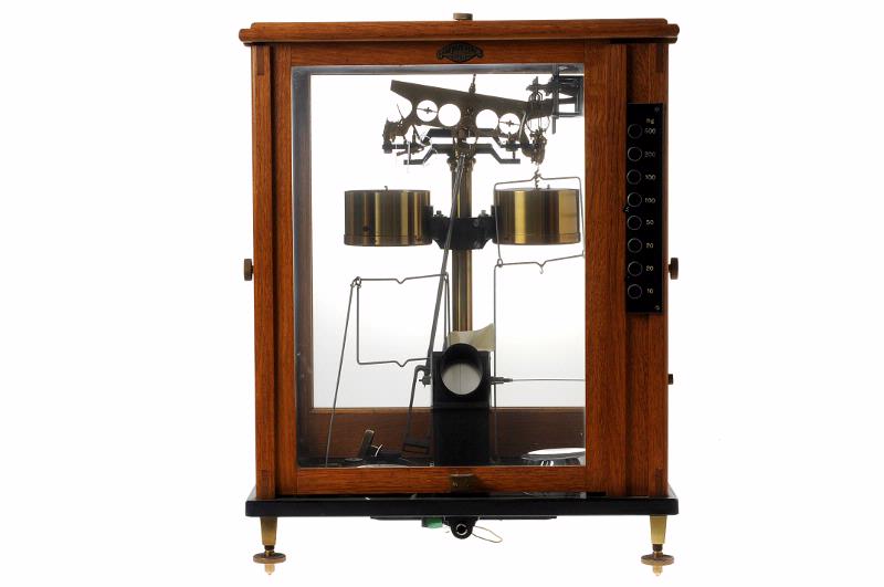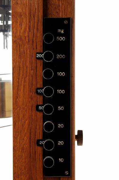 MS 7290. Analysvåg. I skåp av glas och trä. L 365 mm Br 275 mm H 485 mm. Lucka ovanpå, dörrar på sidorna. Vågen är av stål och mäassing. Ena långsidan kan hissas upp. 8 knappar på utsidan för reglering. 10 - 500 mg. Inkom oktober 1973. Märkta. "Sartorius-Werke Göttingen". Vågen (skåpet) vilar på svart stenplatta 370 x 290 mm.