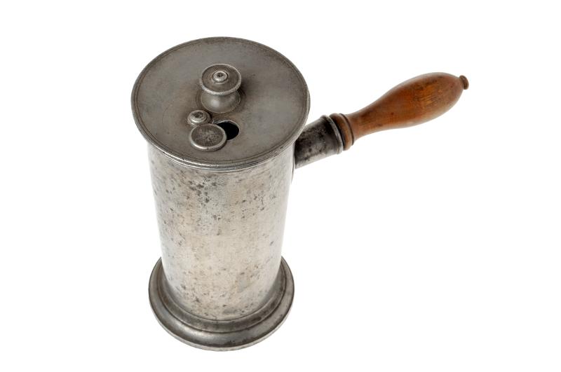 MS 8419. Dekoktkärl i metall med trähandtag. Donation av apotekare Ebba Ginstrup.
