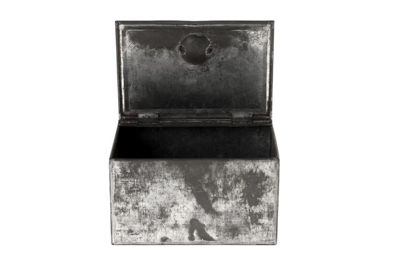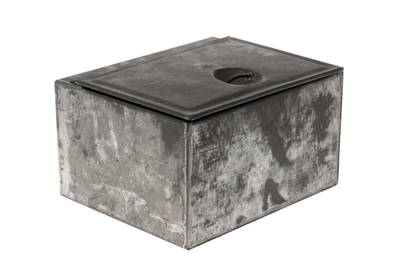 MS 8421. Förvaringsburk i metall, fyrkantig med lock. H 95 mm, Mått botten 140x170 mm. Donation av apotekare Ebba Ginstrup.