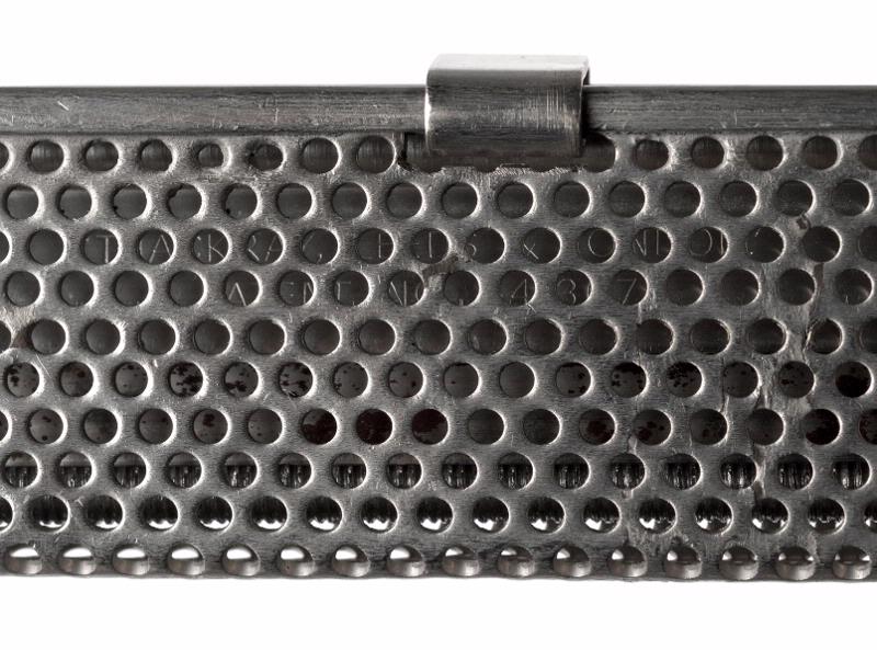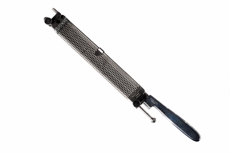 MS 7616. Transplantationskniv. Med skyddshylsa. Av förkromat stål, L 355 mm. Hylsans L 210 mm Br 30 mm, perforerad. Handtaget platt, Br ca 15 mm. Märkt: "Thackray Leeds London England". Rostfri.