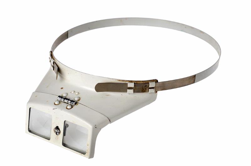 MS 10236. Binokulär huvudlupp. I glas och vitlackerad metall. L 29... (?) Br 175 H 70 mm. På huvudband av fjäderstål är fästad en hållare för två rektangulära ögonglas. Hållarens främre del inklusive ögonglasen är uppfällbara. Märkt: "Bergl.".