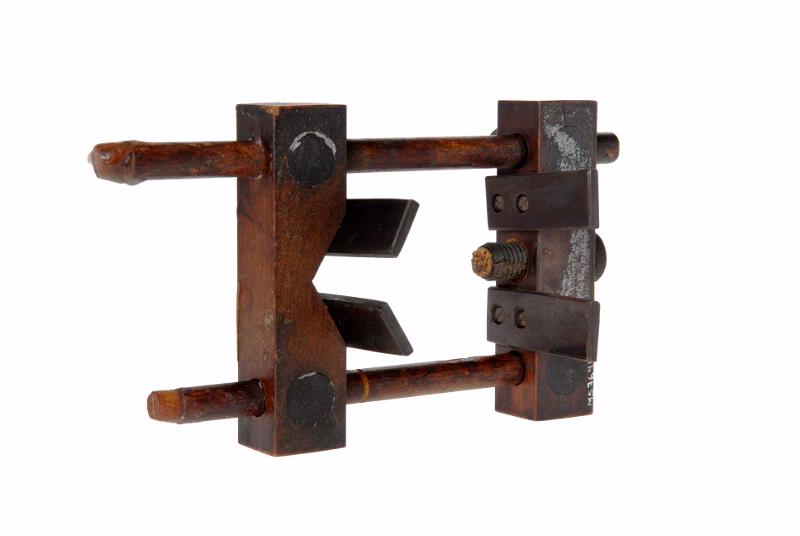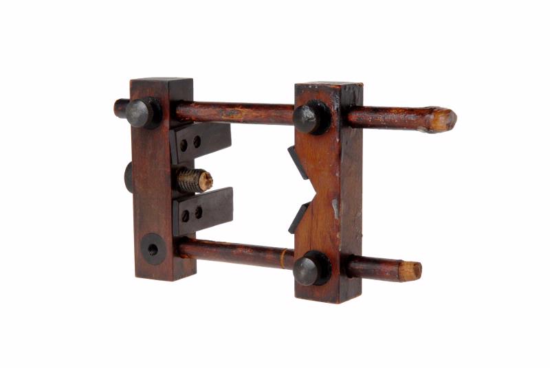 MS 7641. Hållare för röntgenrör. Av trä, rödbrun betsning. Br 125 mm L 200 - 220 mm. Konstruerad i form av en rektangel, klossar som löpare på skenor (cylindriska).