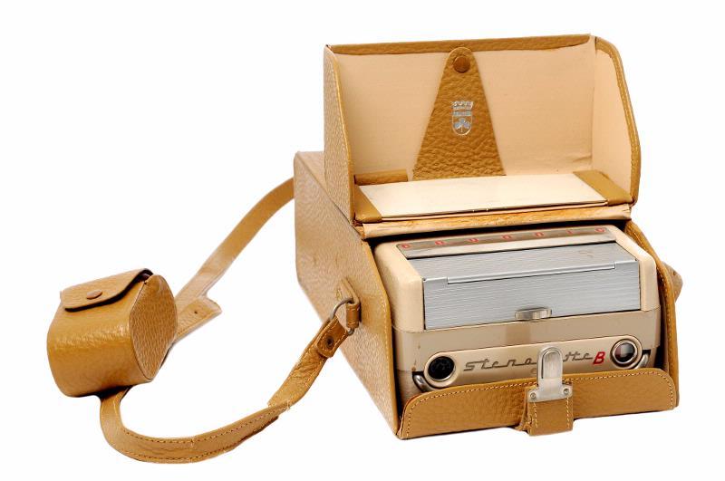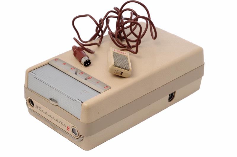 MS 10282. Diktafon i beige-brun plast och metall, "Grundig Stenorette B Made in W-Germany". H 85 L 260 Br 150 mm. Batteridriven bandspelare. Löst lock med jalusiöppning över manöverpanelen. 2 öppna plastspolar (den ena fast) med brun ljudtape. På undersidan fack för batteri/kabel. Förvaras i ljusbrunt läderfodral, H 93 L 275 Br 165 mm. Fast handrem är förlängd med löstagbar axelrem. På remmen fodral för mikrofon, H 50 L 85 Br 50 mm. Mikrofon saknas. Locket till batteri och kabelfacket saknas. Kabel saknas. Från 1960. Inköpt gm Grundigs Malmö-filial. Se Uppgiftsbok 20. Gåva 1987 av Medicintekniska avd. genom Bo Eriksson.