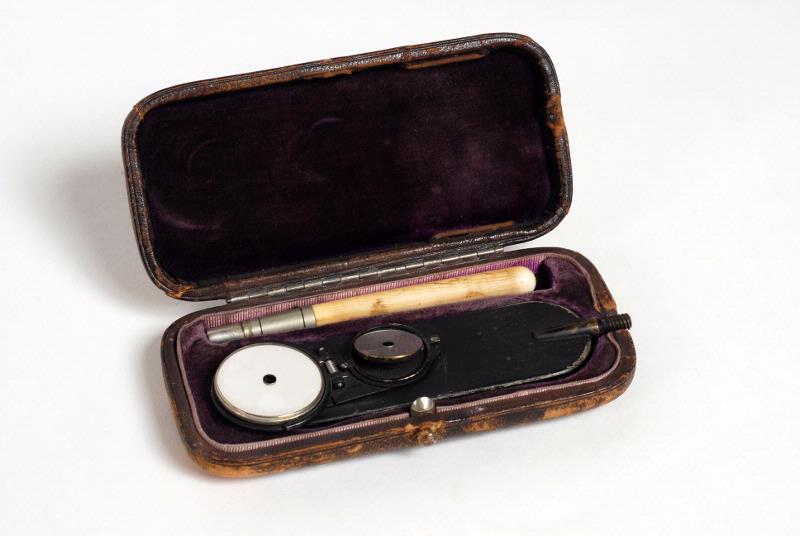 MS 7987. Oftalmoskop. Märkt: "Mortons Oftalmoskop" i slitet, svart etui med lila sammetsfoder. Består av 3 delar. Donation: Läkaresällskapet i Lund.