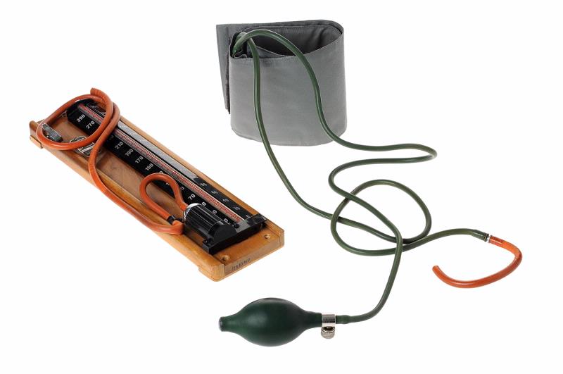 MS 10917. Blodtrycksapparat för väggmontering. Består av: platta av ek, H 355, B 96, med kvicksilvermätare 0-300, märkt: "Erka 500 323" och metalletikett märkt: "Sphygmomanometer Erkameter Germany, Wall-Model Guarantee No. 5102.60". Mätaren är via röd gummislang, L ca 1000 och grön gummislang, L 800, kopplad till blodtrycksmanschett i grått galonfodral, L 620, B 130, med kardborrelås. I fodralet grön gummiblåsa, förbunden med bollpump via grön slang, L 850. På träplattan upphängningskrok för slangarna. Använd 1950-1970.