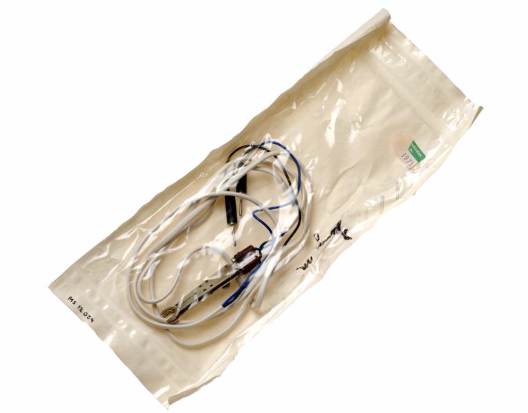 MS 12054. Anslutningsklämma. Med vit respektive blå/svart plastkabel till cystoskop. Ligger i försluten sterilförpackning av plast/papper. L 345 x 150 mm. "Mediplast A 9". Märkt: "(Lung.m.), trasig etikett, ...användes/m/1971". Förvärvat från Lungkliniken genom Sven Gustav Holmdahl.