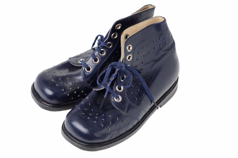 MS 12257. Barnkängor. 1 par. I mörkblått skinn. Läst 6 Storlek 28 standardvidd. För inlägg och skenor. Perforerade. 6 par snörhål, blå skosnören. Lädersulor, gummiklack. Bläcknotering undersidan: "15.10.75".