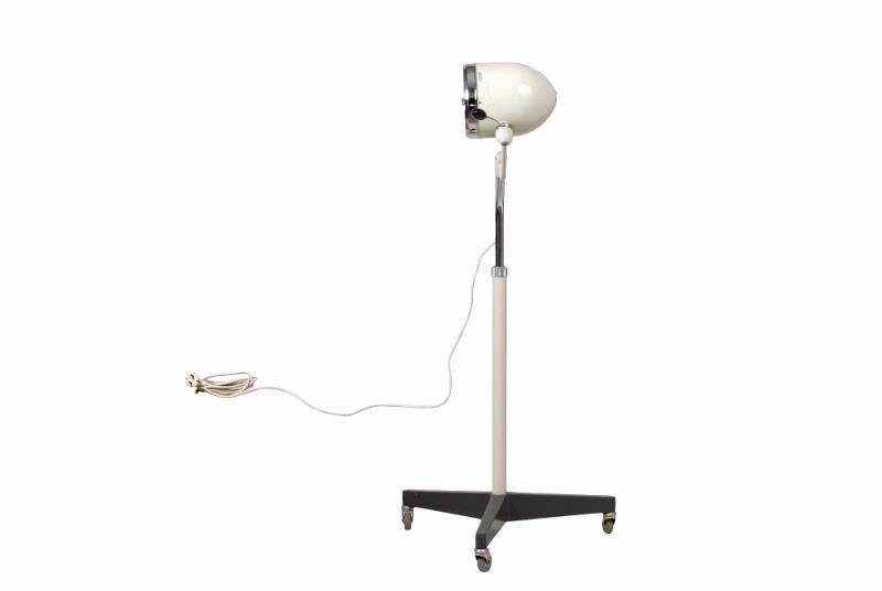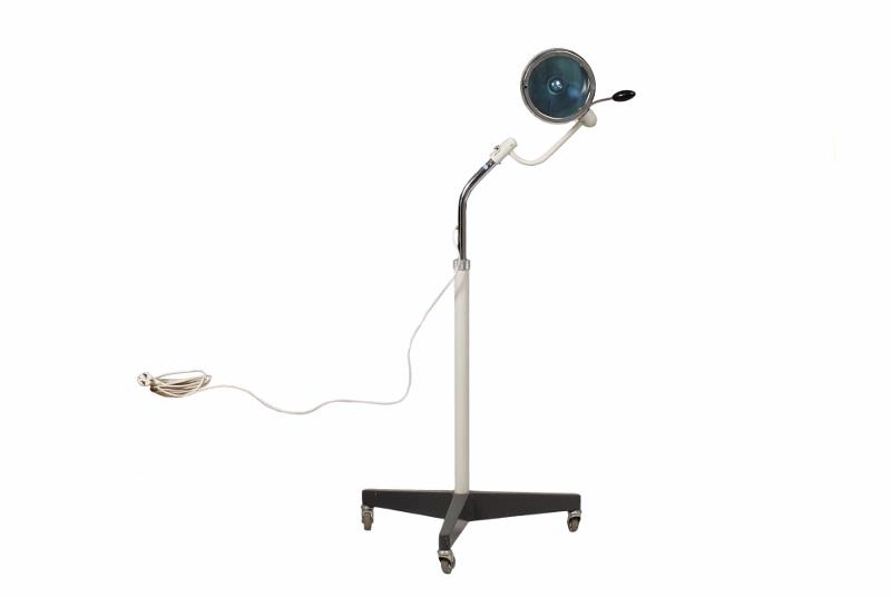 MS 11141. Operationslampa, mobil, i lackerad respektive blank metall. KIFA. H 1350, B 700x600. Vitlackerat stativ på hjulförsedd, grålackerad trefot. Lamparmen bockad i 45°. Lamphuven, L 240, Diam 190, vitgullackerad med glas framför glödlampan. Vit el-kabel. Gåva från Urologiska kliniken genom Eric Lindstedt.