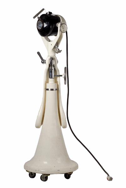 Konformat fundament på 6 hjul med 2-delad hållare för magnethuvudet. Hållarens nedre del omsluter delvis fundamentets övre del och fungerar som motvikt/hävarm. Med hjälp av 3 rattar ges olika rörelsemöjligheter för huvudet. Magnethuvudet är svart och på detta sitter en lampa i blankt metallrör med vit kabel till huvudets baksida. Från huvudet utgår svart gummikabel med rödmärkt kontakt. Metalletikett på huvudets baksida märkt "Schumann AS GM3F Fabrik Nr. ASD 829 Geprüft 5.4.62. A. Schumann. Fabrik für Feinmechanik, Düsseldorff". Etikett: "MLL Inventarienr 2463-2 Ögon op". På fundamentets nederkant 1 rund rödmärkt kabelingång och 1 fyrkantig för fast, svart kabel till el-nät. Även kallad "jättemagnet".