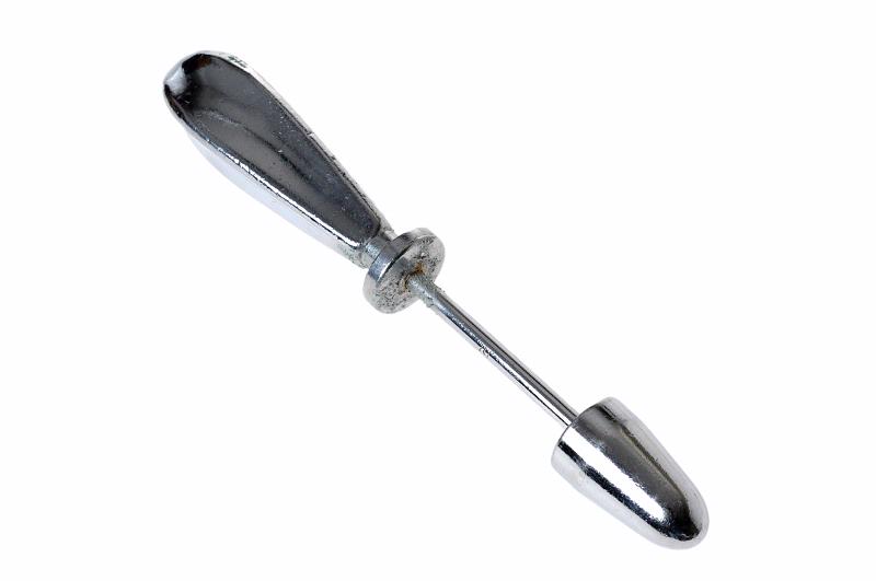 MS 11177. Proktoskop enligt Naunton Morgan, av förnicklad metall. Består av tub, L 75, Diam 21. Handtaget märkt: "Made in England". (Kir. Pol.) Obturatorn, L 170 (Kir. Pol.). Gåva från Medicintekniska avdelningen genom Kornel Sass 1987-12-18.