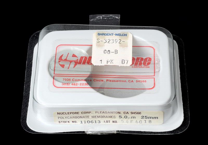 - För urinprov, i vit originalförpackning med genomskinligt lock med röd text: Nuclepore Corporation, 7035 Commerce Circle, Pleasanton, CA. På locket en liten vit etikett med text: Sargent-Welch S-32392-00-B 1 PK D7. Förvaras i trådkorg MS 11186.
