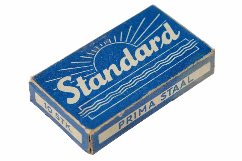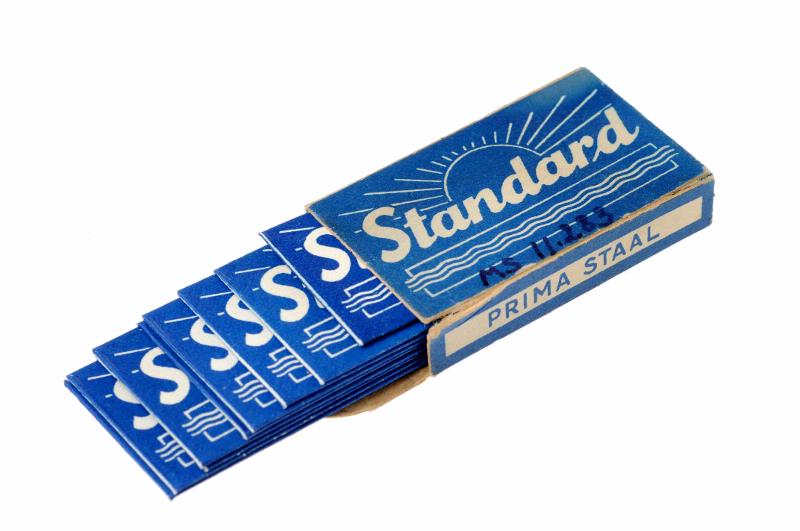 9 st styckförpackade blad i blå ask med vit text: Standard prima staal 10 stk.