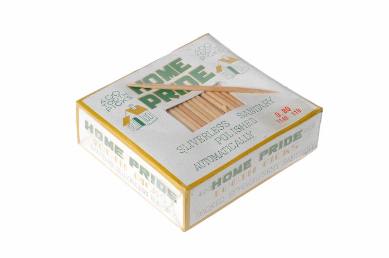 MS 11313. Tandpetare i oöppnad originalask. B 75x70, Tjockl 24. Märkt: "400 HOME PRIDE toothpicks. Automatically packed". Runda, spjutliknande stickor, L 65. Gåva av Helen Torelius Landin.