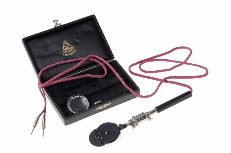 - Ligger i svart skrin. Lock med knäppspänne. Lockets insida klädd i svart. Märkt: Kifa Stockholm". Botten också klädd i svart. Innehåll: handtag märkt: "Reinhold H. Wappler D.R.G.M. Nr 881130"; röd klädd sladd; svart spegelhuvud märkt "May Ophtalmoscope Wappler Electric Co New York; lös glödlampa samt förstoringsglas.