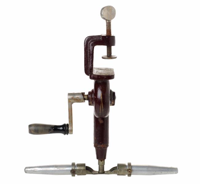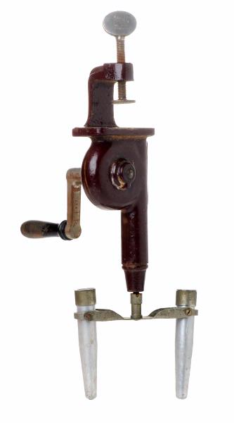 MS 11816. Handcentrifug. För 2 rör. Av rödlackerat gjutjärn, H 310 mm Br ca 150 x 130 mm. 2-armad med aluminiumrör och vev med svart trähandtag. "D.R.G.". Skruvtving för bordsfäste. Förvärvat från lasarettsläkaren K. A Lagergrens efterlevande.
