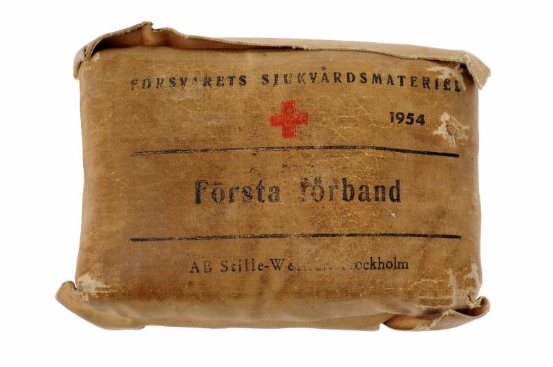 Oöppnad brun förpackning innehållande kompress, gasbinda och 2 st säkerhetsnålar. Förpackningen oöppnad men medfaren. Text på förpackningen: Försvarets sjukvårdsmateriel 1954, Första förband, AB Stille-Werner, Stockholm.