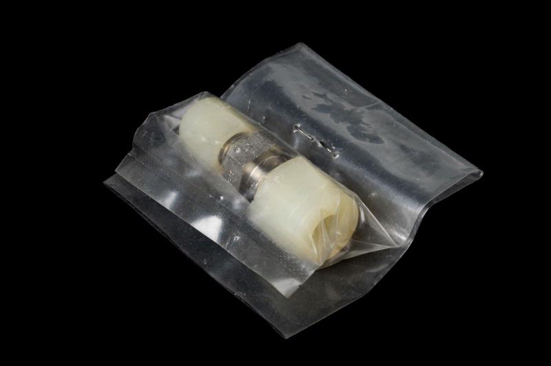 MS 11697. Koppling. Till stödplatta för shunt MS 11692. Av rostfritt stål och plast. Består av två olika stora gängade tappar med plastmutter, på vardera sidan om en sexkantig metallmutter. Fästes på stödplattan. L 35 mm Br 15 mm. Ligger i plastförpackning. Förvärvat från Njurmedicinska kliniken, Lund genom Tore Lindholm 1990. 1 del utgår 2009-06-15.