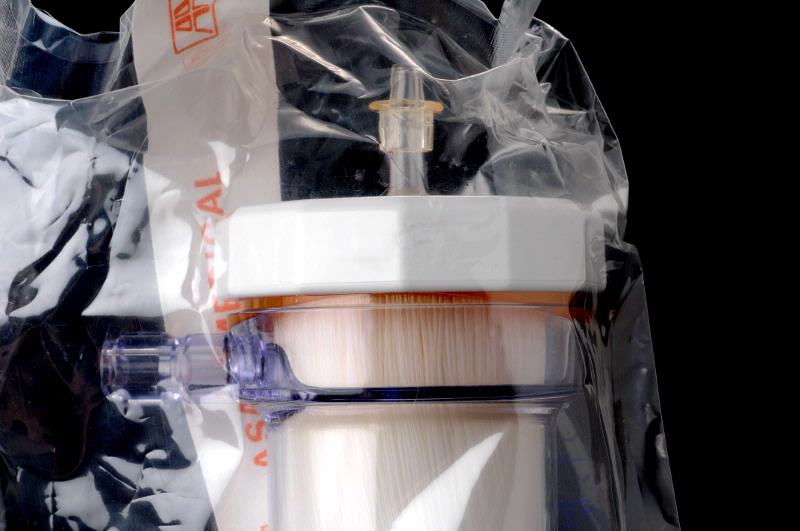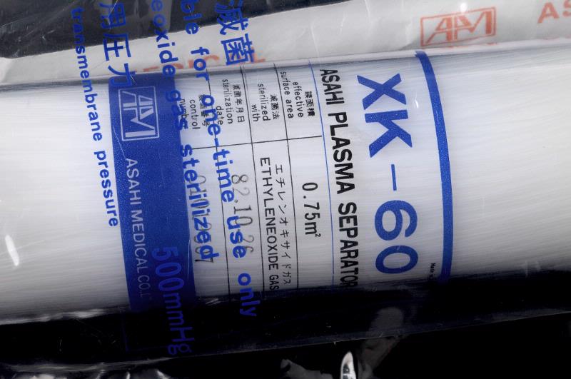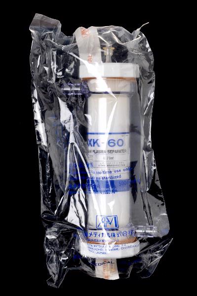 MS 11580. Plasmaseparator/kapillärfilter av plast, för engångsbruk. Sterilförpackad i plast, med blå och svart text på förpackningen. L 380, B 190. Modell: XK-60. Tillverkare: Asahi Medical Co. LTD, Japan. Gåva av Njurmedicinska kliniken 1989.