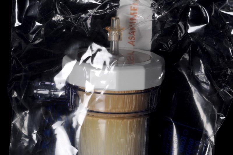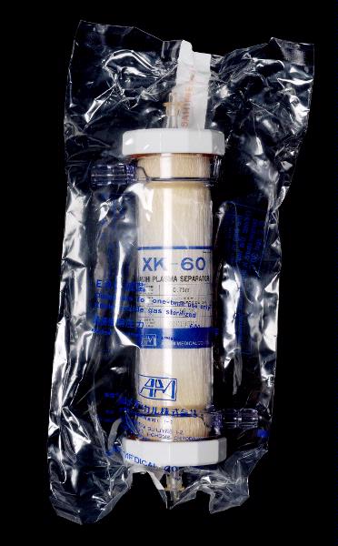 MS 11581. Plasmaseparator/kapillärfilter av plast, för engångsbruk. Sterilförpackad i plast, med blå och svart text på förpackningen. Skumgummiisolerad och i pappförpackning märkt: "Kaskad". H 180, L 350, B 180. Modell: XK-60. Tillverkare: Asahi Medical Co. LTD, Japan. Gåva av Njurmedicinska kliniken 1989.